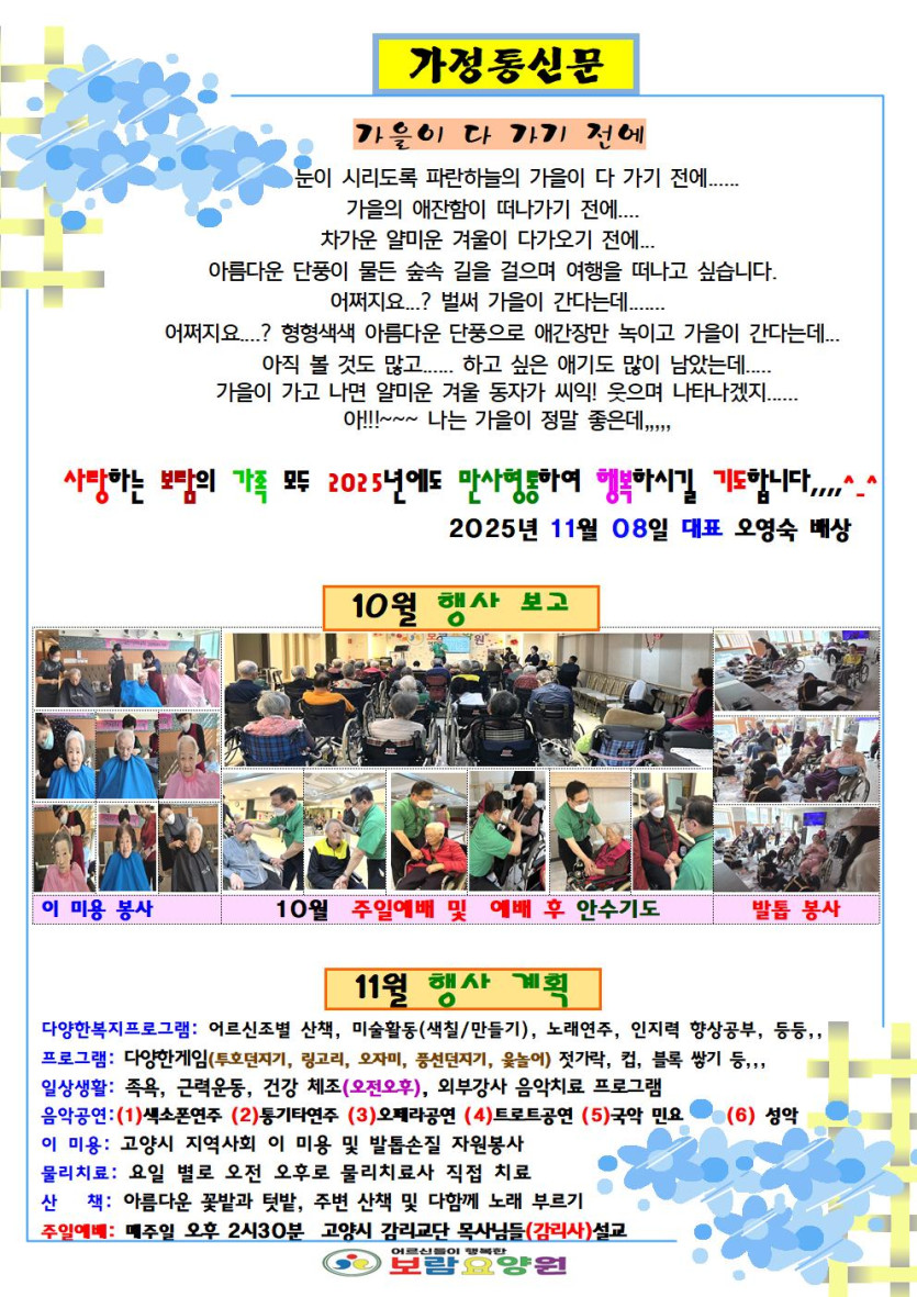 25년 11월 보람요양원 가정통신문 페이지 정보 작성자 보람요양원 댓글 0건 조회 262회 작성일 25-11-08 10:09 목록 본문 ^^ 이전글25년 12월 보람요양원 가정통신문 25.11.30 다음글25년 10월 보람요양원 가정통신문 25.11.08 댓글 0 댓글목록 등록된 댓글이 없습니다. 목록