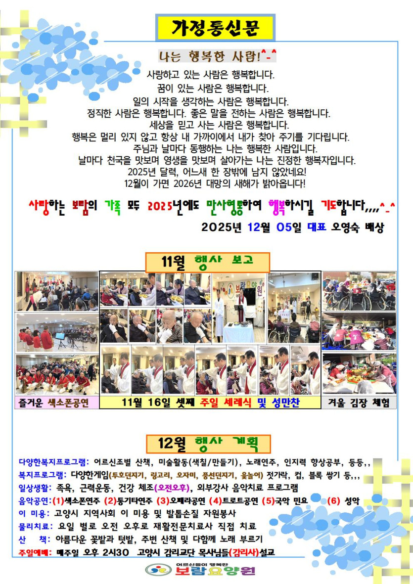 25년 12월 보람요양원 가정통신문 페이지 정보 작성자 보람요양원 댓글 0건 조회 61회 작성일 25-11-30 16:37 목록 본문 ^^ 이전글26년 수가 인상 안내 드립니다. 25.11.30 다음글25년 11월 보람요양원 가정통신문 25.11.08 댓글 0 댓글목록 등록된 댓글이 없습니다. 목록