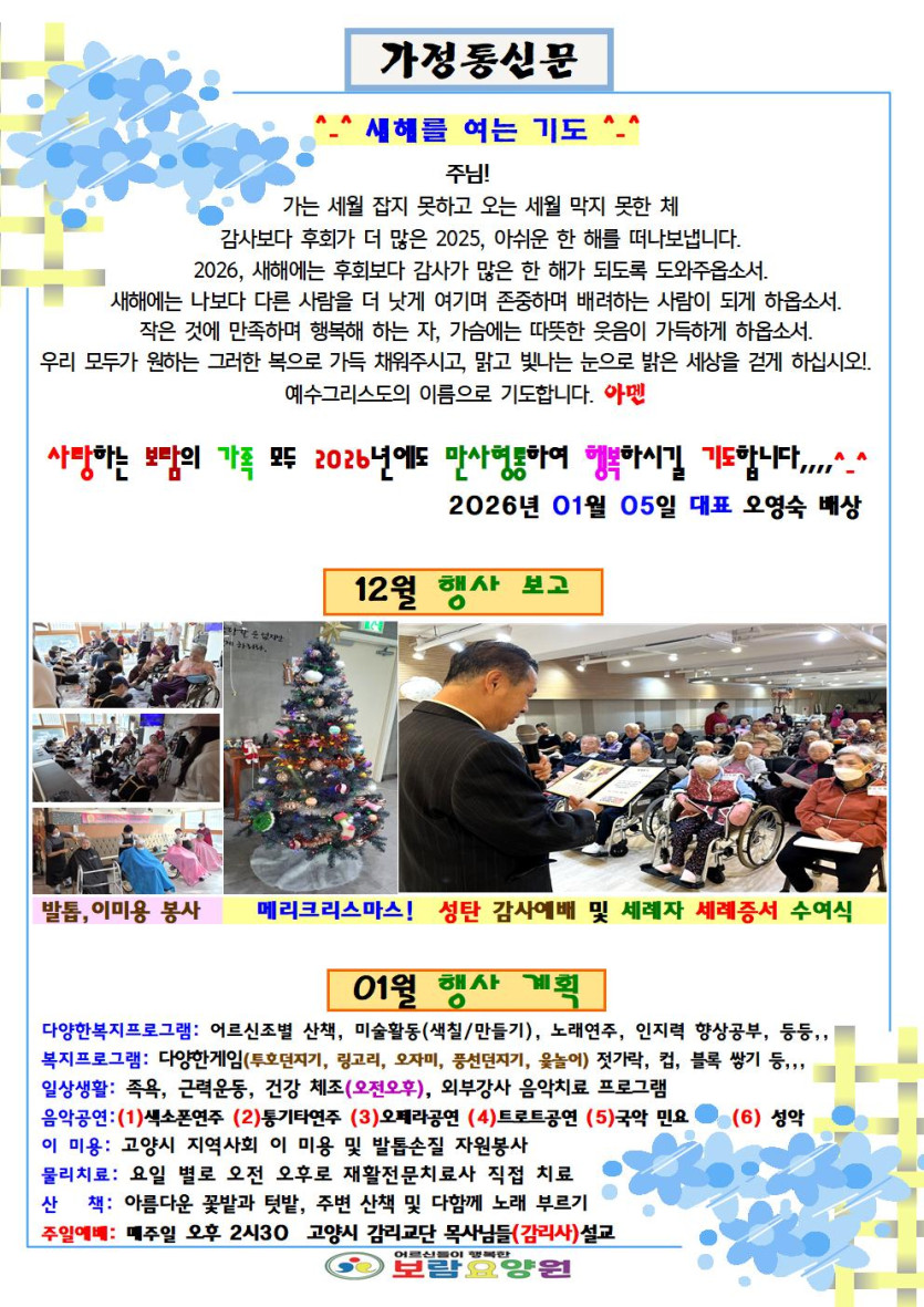 26년 1월 가정통신문 페이지 정보 작성자 보람요양원 댓글 0건 조회 399회 작성일 26-01-06 13:09 목록 본문 ^^ 이전글26년 2월 가정통신문 26.02.22 다음글26년 수가 인상 안내 드립니다. 25.11.30 댓글 0 댓글목록 등록된 댓글이 없습니다. 목록