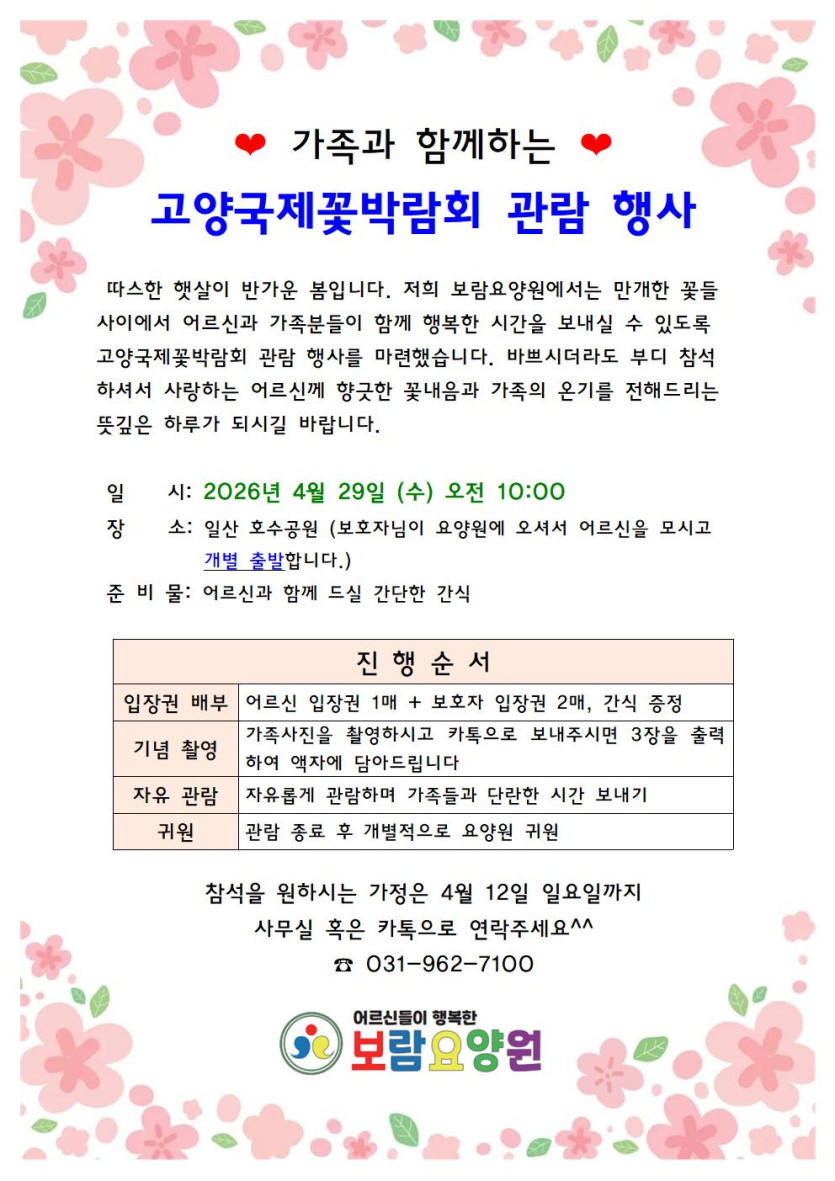 장소: 일산 호수공원 (보호자님이 요양원에 오셔서 어르신을 모시고 개별출발 합니다)