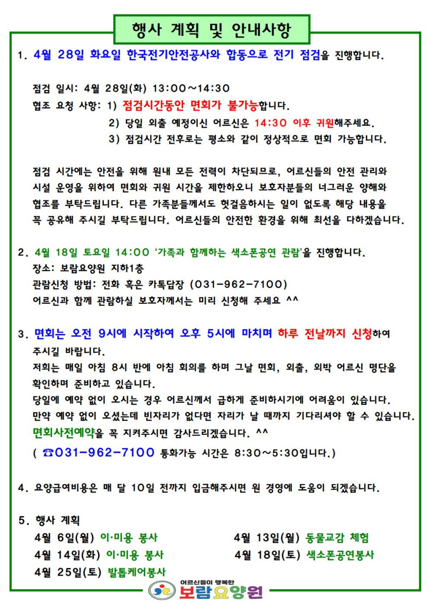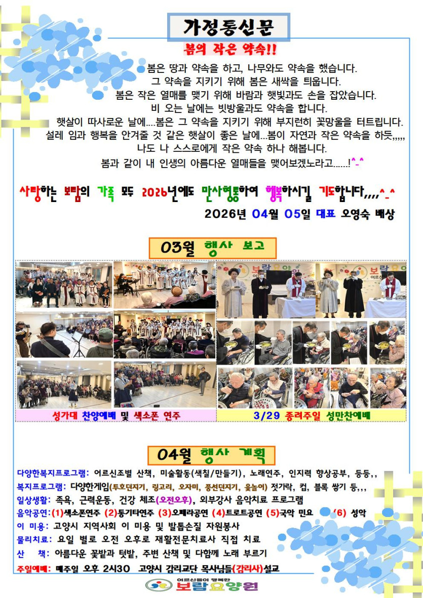 26년 4월 가정통신문 페이지 정보 작성자 보람요양원 댓글 0건 조회 59회 작성일 26-04-01 14:45 목록 본문 ^^ 다음글가족과 함께하는 고양국제꽃박람회 관람행사 26.03.31 댓글 0 댓글목록 등록된 댓글이 없습니다. 목록