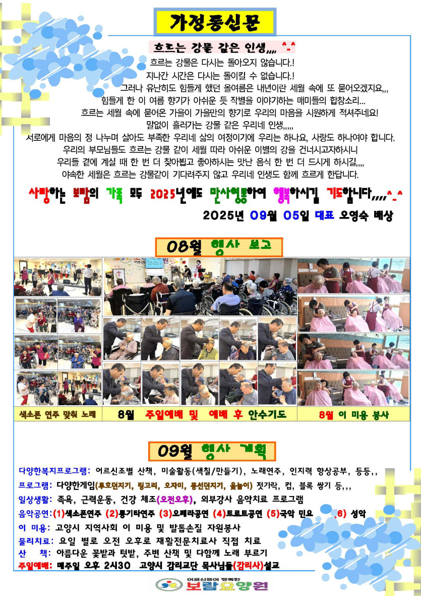 25년 9월 보람요양원 가정통신문 페이지 정보 작성자 보람요양원 댓글 0건 조회 859회 작성일 25-09-07 09:39 목록 본문 ^^ 이전글25년 10월 보람요양원 가정통신문 25.11.08 다음글25년 8월 보람요양원 가정통신문 25.09.07 댓글 0 댓글목록 등록된 댓글이 없습니다. 목록