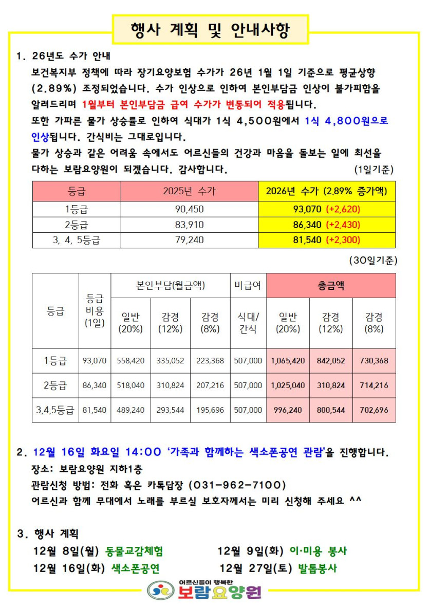 25년 12월 보람요양원 가정통신문 페이지 정보 작성자 보람요양원 댓글 0건 조회 61회 작성일 25-11-30 16:37 목록 본문 ^^ 이전글26년 수가 인상 안내 드립니다. 25.11.30 다음글25년 11월 보람요양원 가정통신문 25.11.08 댓글 0 댓글목록 등록된 댓글이 없습니다. 목록